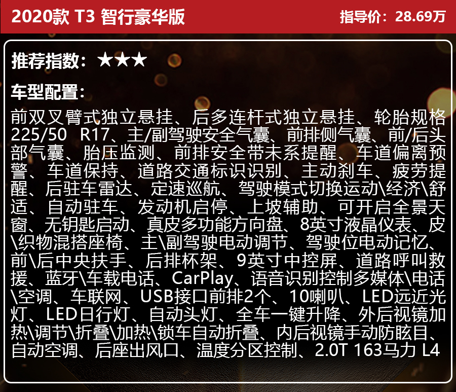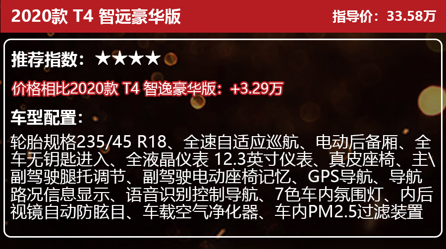 燃油版车型次推售价为33.58万的2020款 T4 智远运动版。虽然同为T4版本车型,该版本车型拥有外观套件以及运动座椅,我认为在颜值上其表现更为抢眼。此外,该版本车型还有全速自适应巡航、电动后备厢、全车无钥匙进入、全液晶仪表 12.3英寸仪表、真皮座椅、主副驾驶腿托调节、副驾驶电动座椅记忆、GPS导航、导航路况信息显示、语音识别控制导航、7色车内氛围灯、内后视镜自动防眩目、车载空气净化器、车内PM2.5过滤装置等实用配置,如果预算允许的情况下多花3.29万换取这些配置也是值得的。
