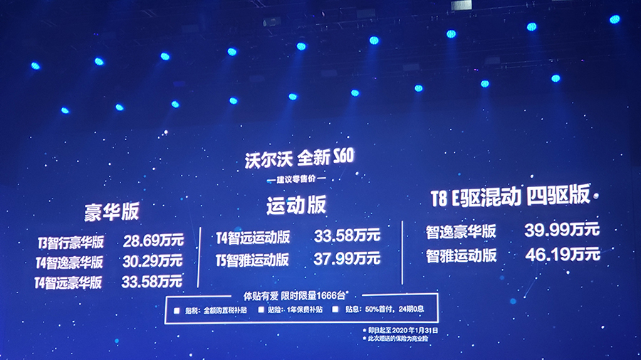 12月12日晚,沃尔沃全新S60正式上市。新车推出了包含T3、T4、T5以及T8一共4个动力版本在内的7款车型。其中燃油版本车型售价区间为28.69万-37.99万元,T8 E驱混动版车型的售价区间为39.99万-46.19万元。同时官方还宣布限量1666台可享受全额购置税补贴、1年保费补贴、50%首付,24期0利息等政策。沃尔沃全新S60有哪些亮点?旗下7款车型哪款值得购买?它的市场前景如何?小智今天就带大家一起来看。