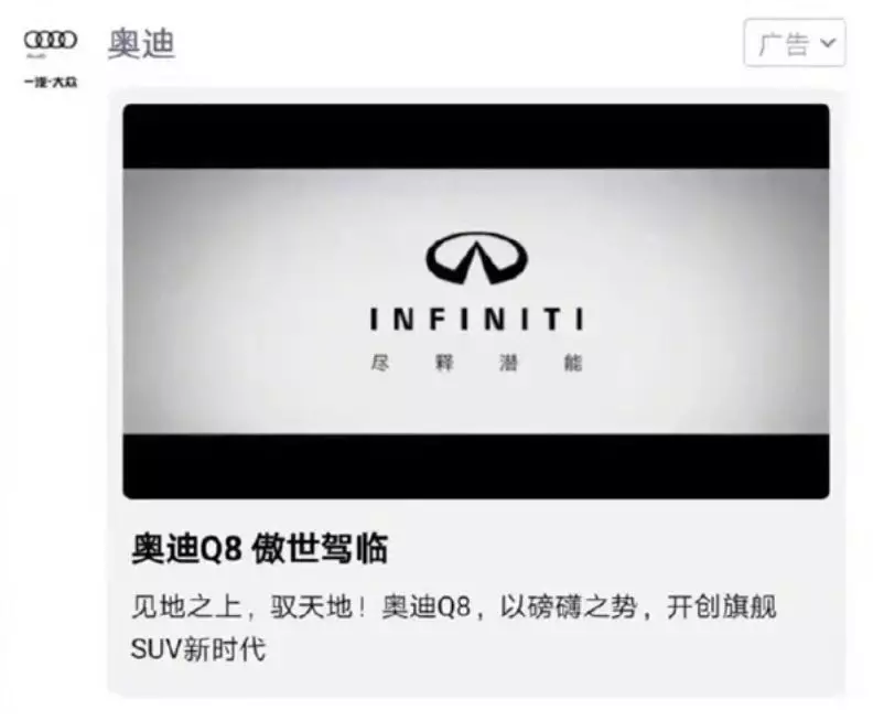 这个素材本应是奥迪Q8,结果视频内容却变成了英菲尼迪Q50X,之后腾讯广告赶紧发道歉声明,并立即暂停下线,声明中指出:此次广告总曝光为3959次,共花费202元。