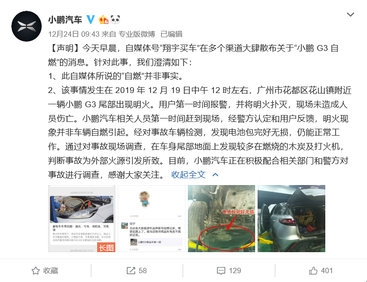 12月24日,小鹏汽车官方社交媒体账号声明称,网上流传的小鹏G3自燃并非事实,初步判断事故由外部火源引起。