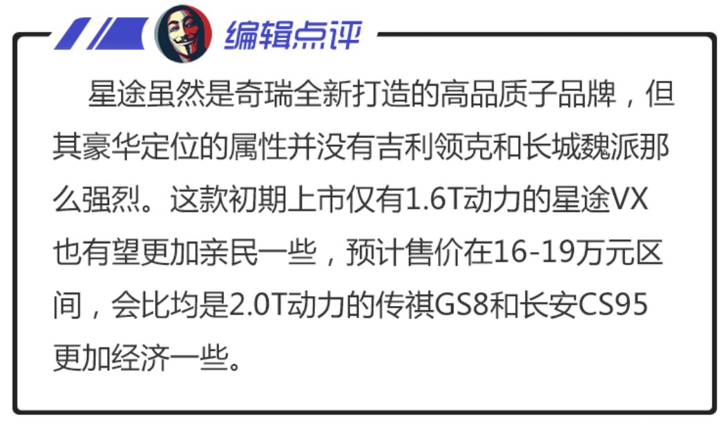 明年一季度上市的星途VX配置了奇瑞SQRF4J16型号1.6T直喷发动机和7速DCT双离合变速箱,这同时也是星途LX、TX和TXL,以及奇瑞瑞虎8的动力配置。对比同样是七座SUV的瑞虎8,星途VX的轴距要长了190mm,长宽高也分别比瑞虎8多了270mm、60mm和49mm。