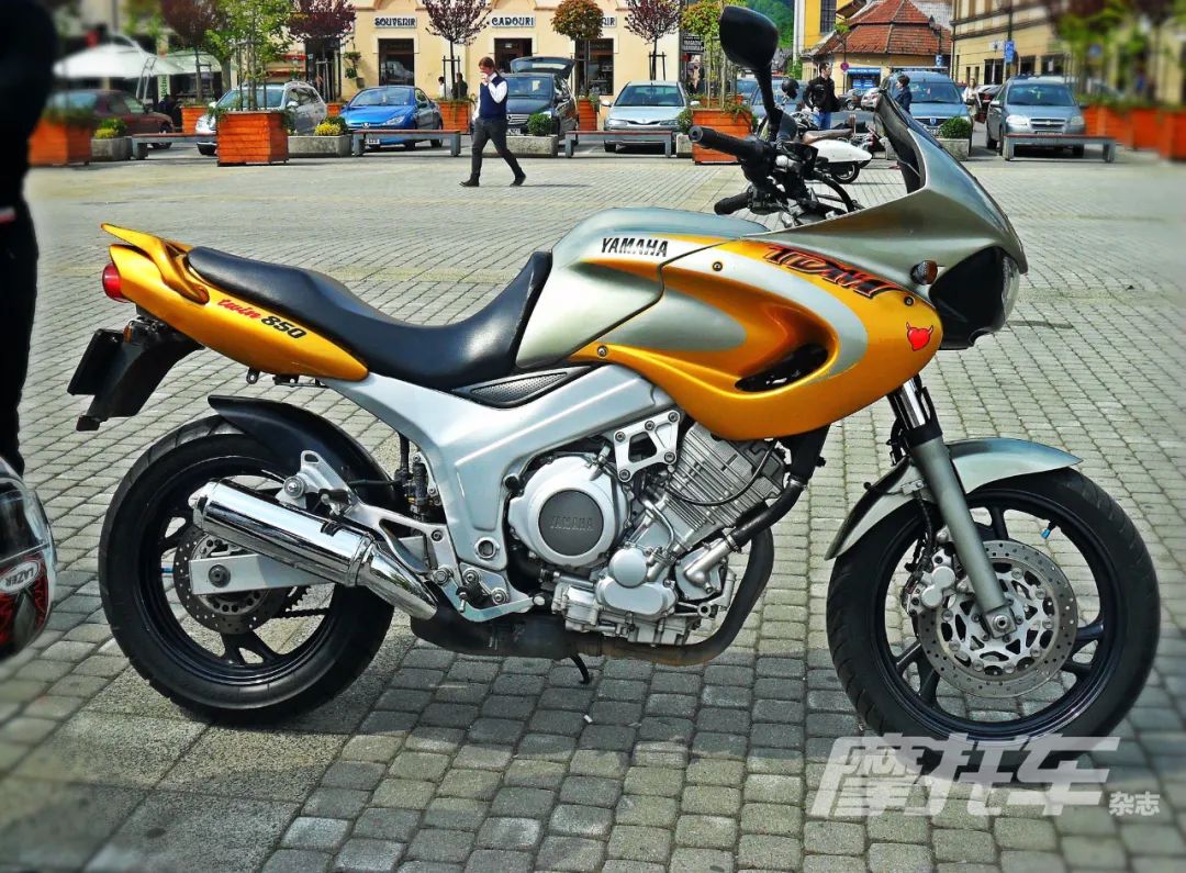 除了用在运动车型之外,5气门技术还被雅马哈用于运动旅行车上,这就是TDM。提到这款TDM,可能很多车迷并不是很熟悉,不像雅马哈的超级跑车YZF-R1、“大力神魔”VMAX那样如雷贯耳。确实如此,因为TDM是专门为欧洲市场设计的,在其他国家和地区比较少见。1991年,充满想象力的雅马哈工程师推出了TDM850,它理念独特、个性鲜明。虽说是运动旅行车,但是悬挂系统的行程较长,最小离地间隙较大,很有些滑胎车的味道。当然,TDM850不但造型桀骜不驯,内心同样不走寻常路。它所搭载的849mL并列双缸发动机,采用了独特的3进2排的5气门技术,可以输出57kW的最大功率和80N·m的最大扭矩。上市之后,TDM850在欧洲市场受到了热烈欢迎,从1991年上市到2000年,共销售了62000辆。