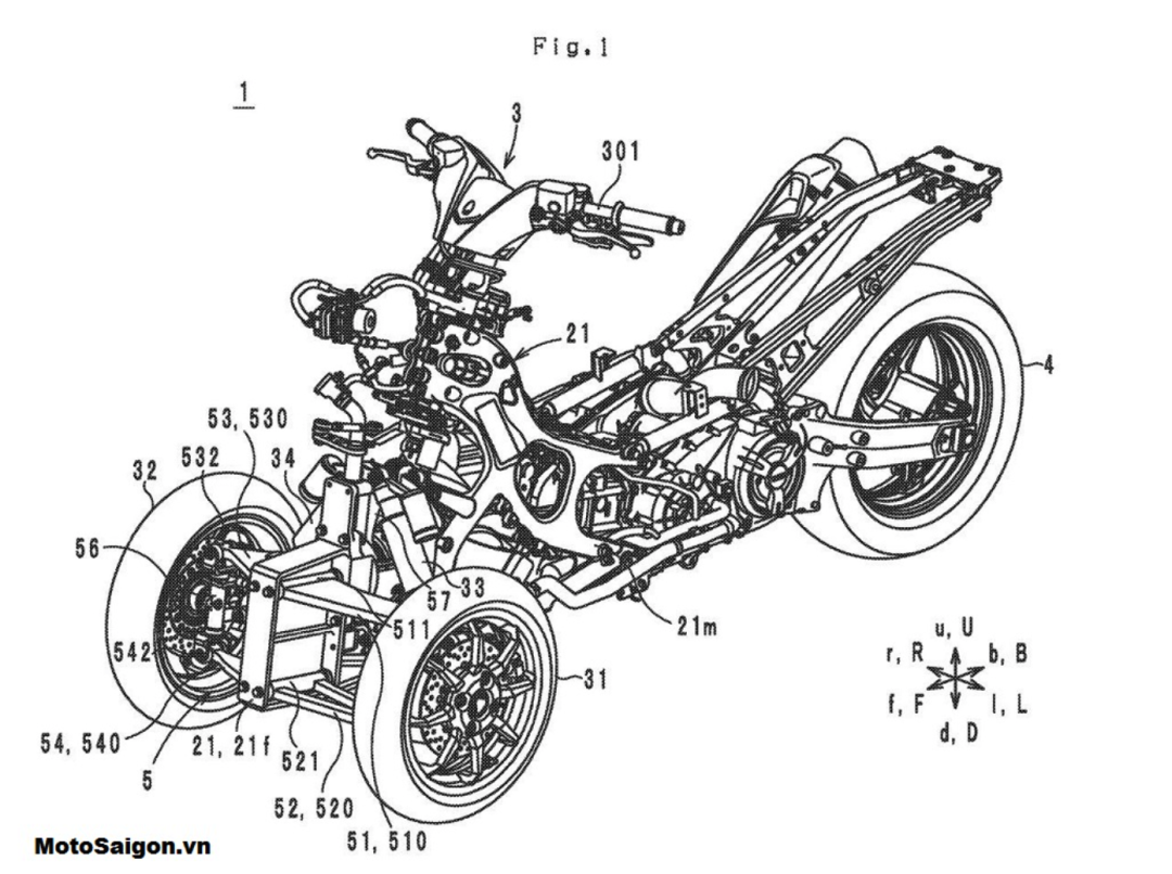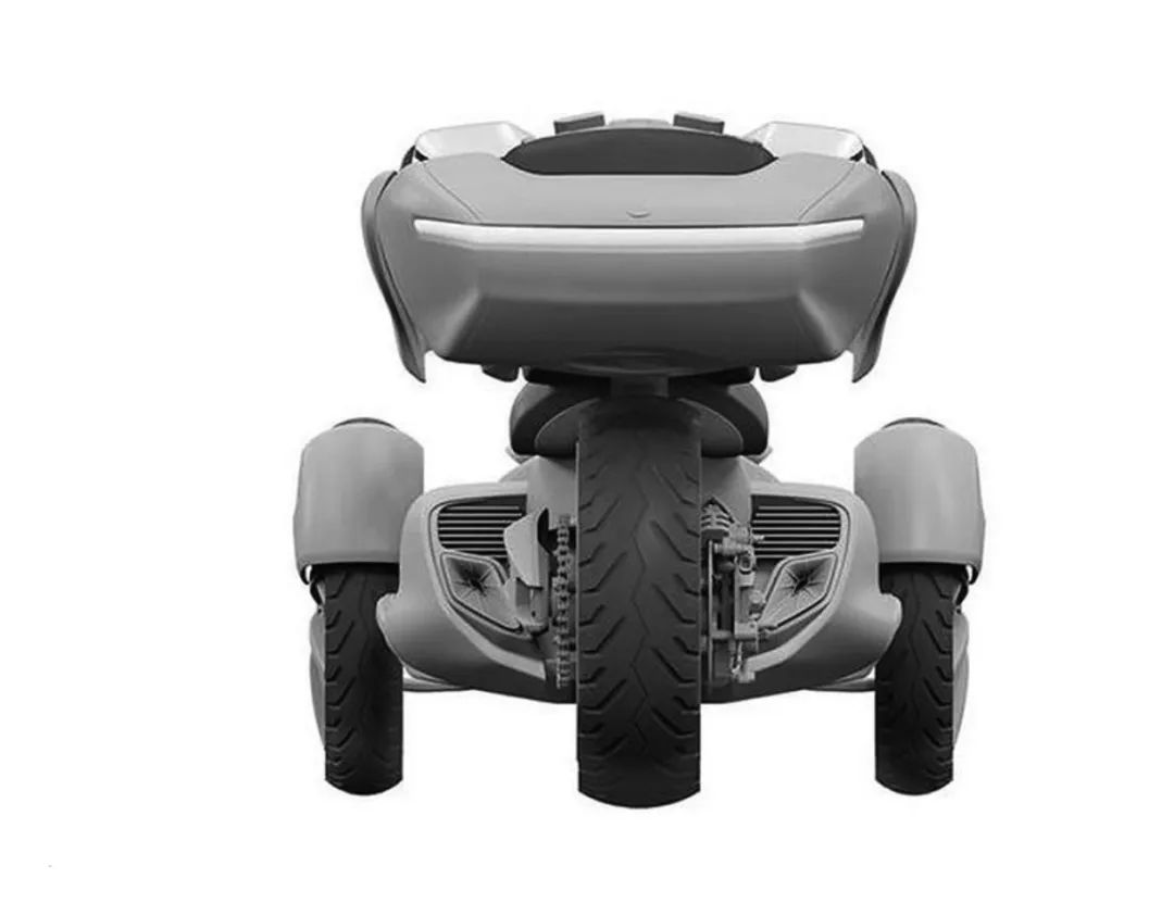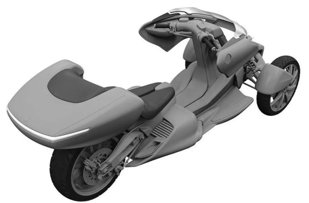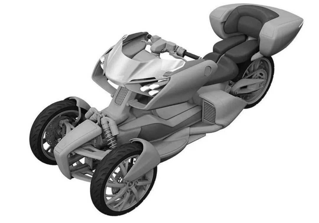 看到这张整体的车型专利图很容易就把这台车跟庞巴迪的倒三轮联想在一块,但是从结构上能够看得出这台车是可以倾倒的,并且从完整的专利图来看雅马哈也很有可能将这台Tromatic 560搭载油电混动的技术再配合T-max560上的双缸发动机。