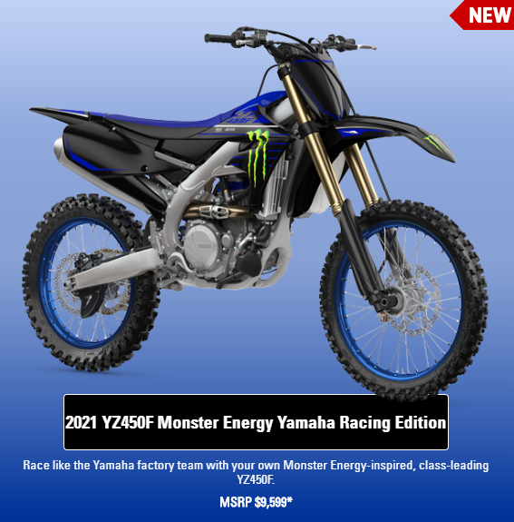 2021 YZ450F售价为9399美元,YZ450F Monster Energy Yamaha Racing Edition赛事版售价为9599美元。