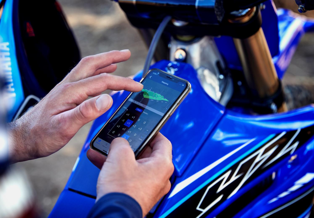 还有一项重大更新便是新款YZ250F支持通过APP无线调节发动机性能,用户可以使用免费提供的雅马哈Power Tuner APP通过车辆板载无线与其连接,在手机上就可调整ECU数据、油门响应、点火正时等发动机数据,在骑行中也可以通过车把上的双模式开关在自定义的两个ECU程序之间进行选择,可以说是相当专业的配置。