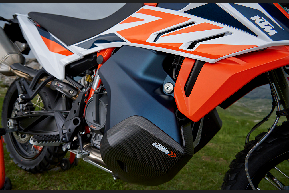 油箱低置是790 ADVENTURE系列的设计核心,重心更低、车手膝盖区域的车身更窄,便于车手控车。R版使用的是达喀尔同款材料的底护板,已经具有很强的防护力,升级后的RALLY版使用的是轻型却经久耐用的碳纤维油箱保护器,为车手提供在更极端地形上骑行的保护,让车手更加安心。