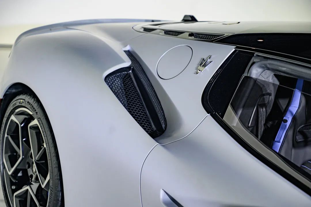 前格栅自然是MC20标志性的设计元素,鲨鱼嘴的造型看得出是在向前辈车型们致敬。除此之外,标志性的前格栅还有另一个作用,就是把人们的视线吸引到海神三叉戟的徽标上。而当你的视线离开这里后,你才会注意到两侧巨大的中冷器进气口和碳纤维的导风刃。同时得益于1.2米的车身高度,MC20的视觉效果非常低矮,给人的感觉会更加沉稳。(前脸并没有为前车牌预留安装位置)