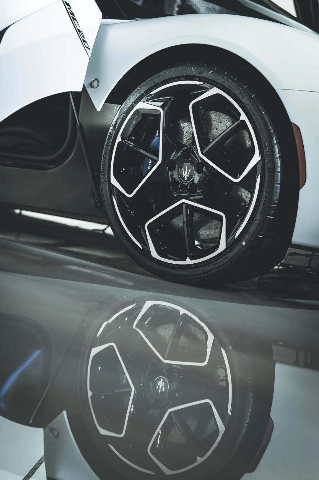 三幅式的轮毂造型来自于玛莎拉蒂经典的概念车Birdcage 75th Concept上的轮圈,轮圈采用了扁平式的设计,四条普利司通搏天族系列轮胎为性能提供保障,前轮规格245/35 R20,后轮则达到了夸张的305/30 R20。前六活塞后四活塞的卡钳由Brembo提供,再加上碳陶瓷刹车盘,MC20绝对满足下赛道的需求。