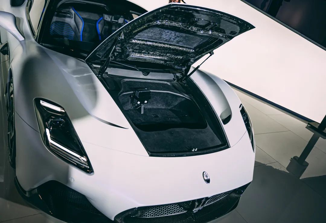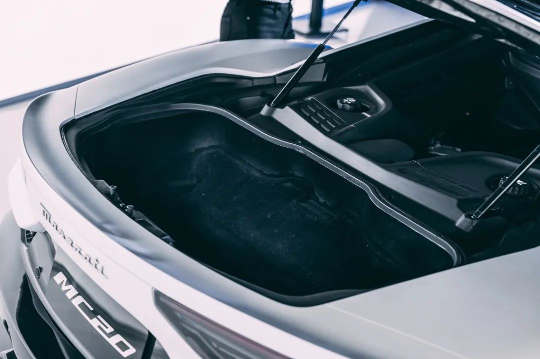 中置发动机的布局也让MC20有了一个小小的行李箱,容积在100L左右,放一个登机箱没有太大问题,当然代驾司机的折叠自行车自然也不在话下。