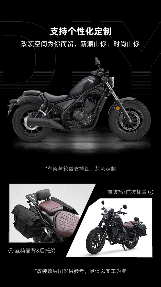 随着本田CM300/500在华陆续交付用户,本田方面也给出了用户可以定制CM300不同配色风格的方案,相信我们中国的改装达人们也会给出自己的改装创意。鲍勃风、攀爬风……拥有强大改装潜能的CM车系,期待更多的灵感、更多的想象!