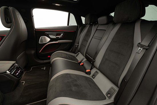 内饰方面,新车在保留奔驰EQS科技化设计的同时针对材质进行了升级,包括翻毛皮座椅以及丝绒脚垫和行李箱垫均散发出浓郁的豪华气息。此外,车内氛围灯也更换为醒目的红色,并配有博速发光LOGO标志的车门防擦板,彰显独特定位。