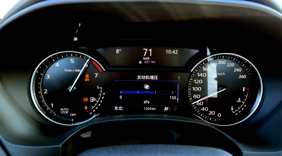 此外,不知道是不是因为发动机排量减小,额外产生热量降低了的缘故,相比2.0T CT4激烈驾驶时会轻松飙到130°C的机油温度,此次1.5T车型全程维持在108-110°C区间的机油温度就要显得“冷静”太多了。要知道的是,110°C只是2.0T CT4在120km/h巡航时的机油温度......