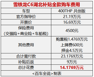 目前,湖北省雪铁龙C6按照补贴来说,卖得较好的是400THP 共创版。但是购车详情如下,首先你得按照指导价刷卡21.19万元,但是开票价只有16.69万元,其中的4.5万元作为后期短时间内不过户的保证金,也就是押金。所以前期总计需付款23.1769万元,后续的9万(包含4.5万押金)会在一定时间后退还到卡上。