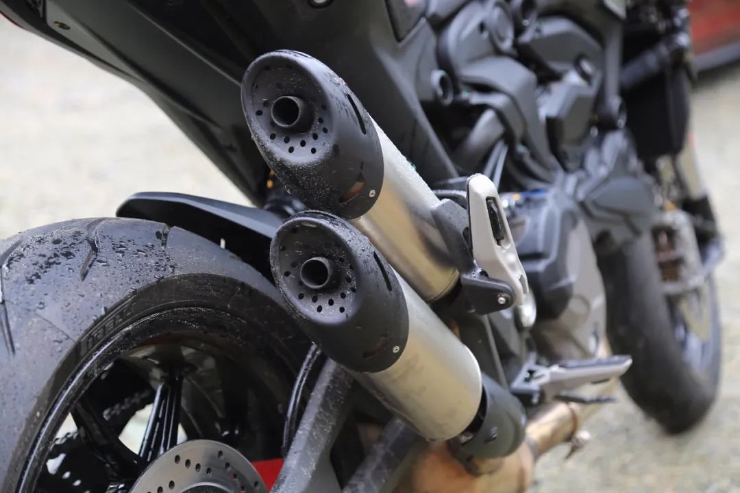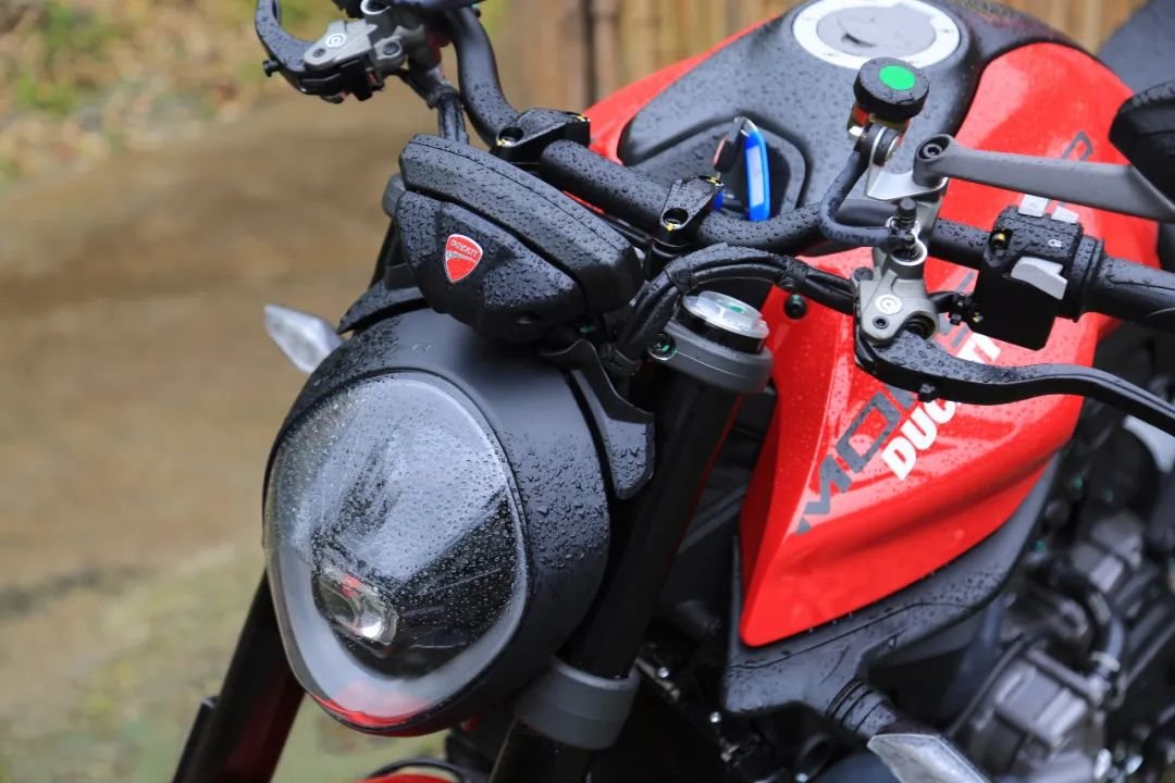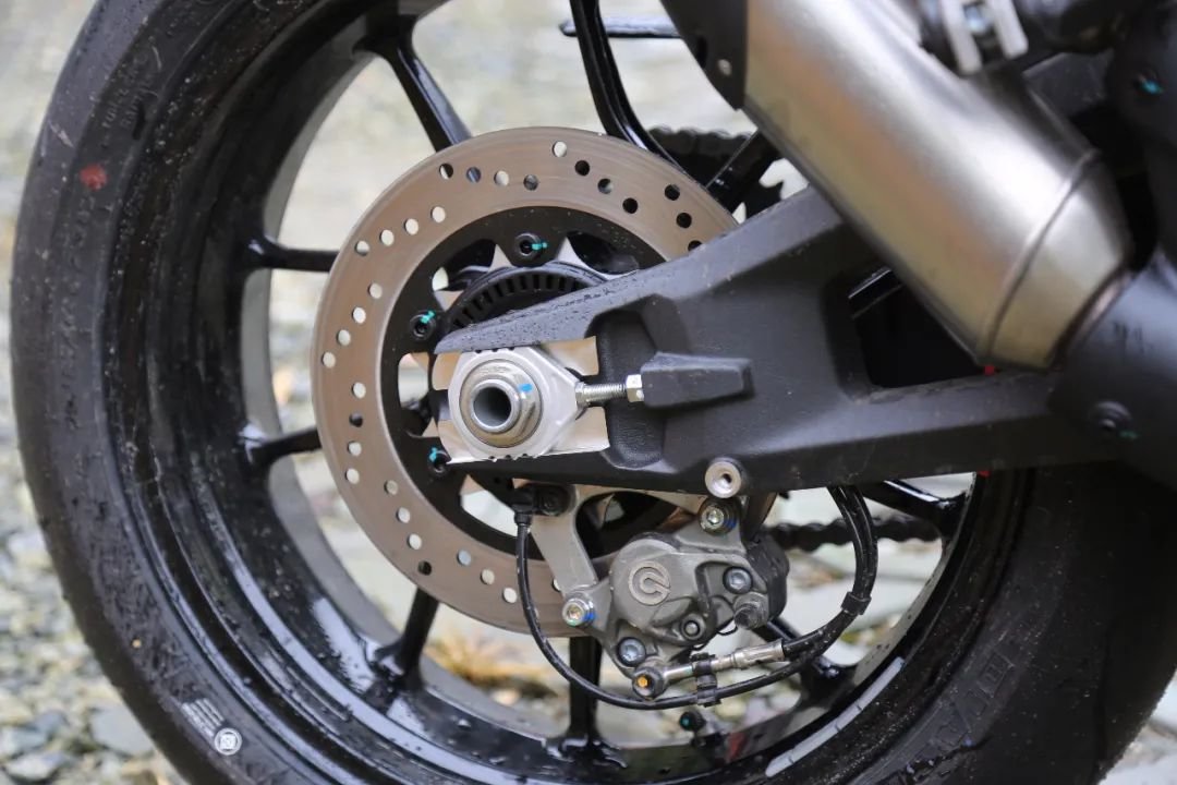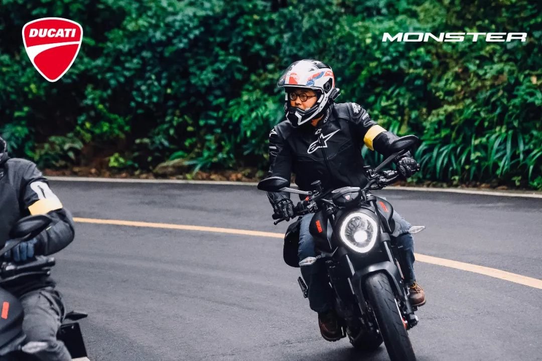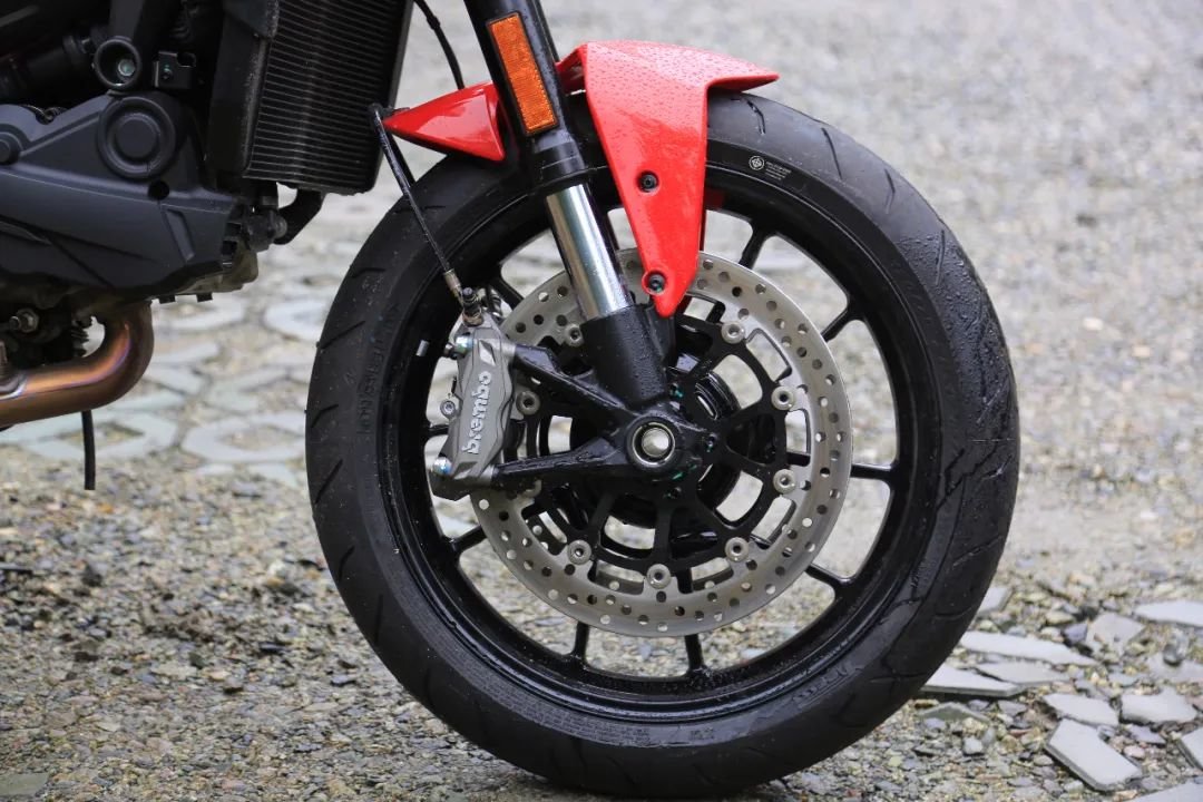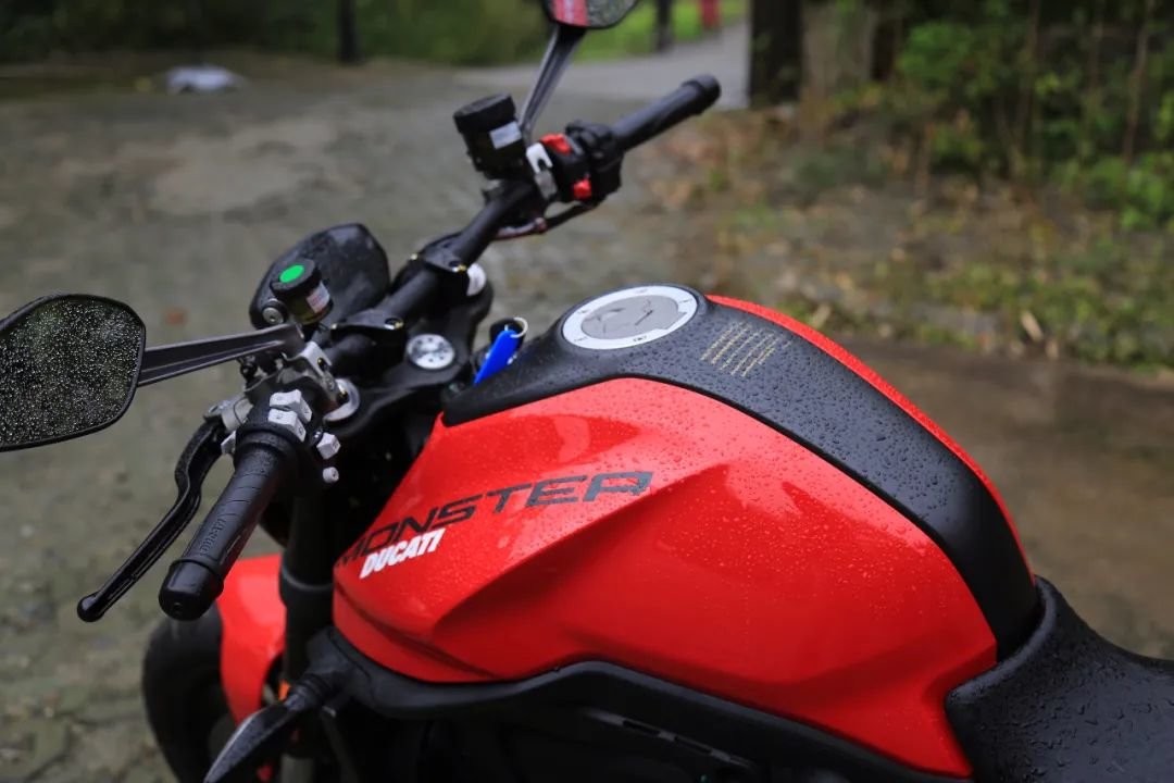 2021款Monster减震方面配备了43mm倒立式前叉及多连杆式的中置后减震,预载可调。前制动为Brembo M4.32对向四活塞辐射式卡钳配320mm双浮动盘,后制动也采用Brembo双活塞卡钳配245mm单盘,搭载ABS系统且具有弯道ABS功能,让骑手在弯道中激情劈弯时,即便遇到意外状况也能在弯道中放心大胆的进行制动避让,极大提高了安全性。新款Monster的车把还向后移动7mm,舵角增大,脚踏位置也做了调整,使得骑手的骑行姿势更直立。轮胎规格为前120/70 ZR17、后180/55 ZR17,搭配的是倍耐力恶魔3运动轮胎,在湿滑的青城山山路上也有着不错的抓地性能。