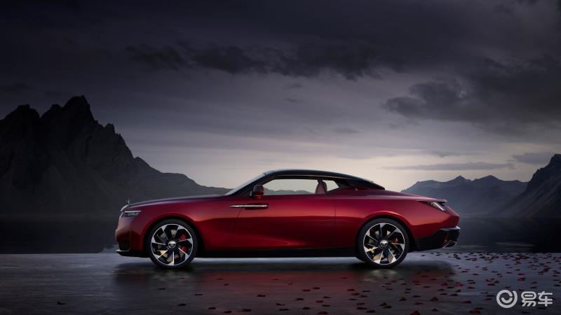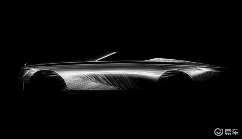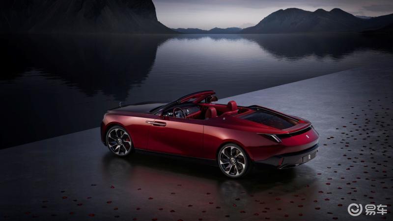 来到车身侧面,新车长5.3米、 宽2米,其外观尺寸令人回想起劳斯莱斯早期经典双座跑车的紧凑侧面比例。低趴的 车身姿态自信果敢,同时保证了宽敞而舒适的车内空间及紧致优雅的型面线条。车身侧面造型如雕塑般夸张地向座舱收敛,车身线条从前轮处开始逐渐下降,将人们的视线引向车尾和逐影个性鲜明的“帆形斗篷”结构,这一结构强化了其双座跑车的身份特征。