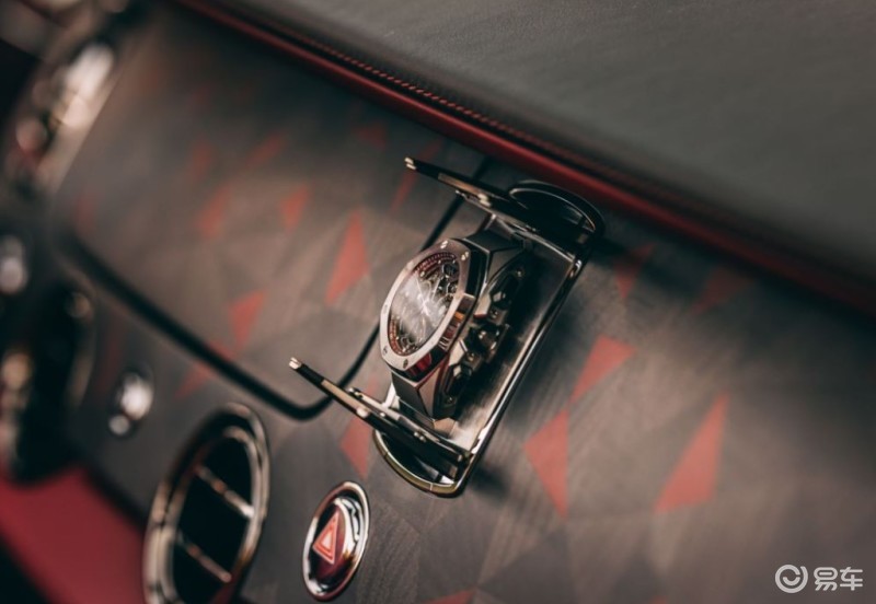 逐影“夜阑玫瑰”的两个座椅边缘分别饰有深红色的“神秘”皮革和浅红色的“真爱”皮革,中控区域还镶嵌着一枚由客户特别定制的爱彼孤品钟表。客户对于钟表的镶嵌工艺提出了更高的要求——钟表既需要安置于爱车之中,同时也需要便于拆卸,用以安装在表带上直接佩戴。为此,劳斯莱斯采用了一种电动表扣装置,只需轻轻按下按钮,钟表就将缓缓推出。为展示客户的专属佳酿,该款逐影配备了特制的香槟酒柜,只需按下按钮,香槟柜就会自动开启,一套精致的香槟酒具焕然其中。