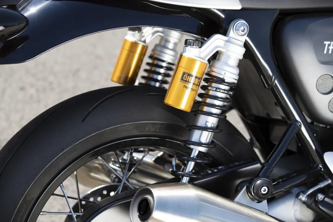 优化操控性能的不仅是减重,还有高规格车架。Thruxton 1200 RS配置了运动感很强的悬挂系统,前端安装的是昭和43mm倒立式前叉,采用了独特的大活塞技术,内置大容量的阻尼室,从而在前叉伸缩时显著减少了所产生的液压,让整个减震过程变得更顺畅,特别是行程首段的压缩更准确。骑手最直接的体验,就是可以获得优化的操控性能,前叉能向骑手提供清晰的反馈,猛烈制动时感觉前端更加稳定扎实!后部则用上了完全可调的Ohlins背负式减震器,即使骑手跑得比较猛,也能提供均衡稳定的悬挂性能。当然,你不用担心跑起来收不住,Thruxton 1200 RS安装了强大的制动系统,特别是前轮换上了高水准的布伦堡4活塞单体卡钳,只需轻搭2根手指,M50卡钳就果断咬住两只310mm浮动盘,强劲持续的制动力迅速拉住飞驰的脚步!