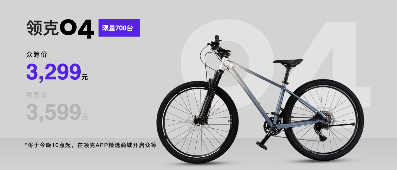 本届Co客大会上,2024全新领克04——全地形越野自行车 百万车主限定款重磅发布,并于11月18日22点起在领克App精选商城开启众筹。这款由领克设计,与“中国国家山地自行车队”同一生产厂家定制的全地形越野自行车限量1000辆,零售价3599元,众筹价3299元。