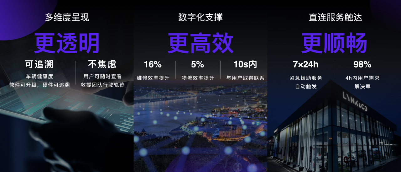 以“亲和、高效、专业、愉悦”为特色,“领悦”为用户提供全生命周期的数字化透明,包括车辆健康度、软件使用情况及升级、硬件可追溯,也包括上门取送车、道路救援、保养服务等各类服务项目的全过程透明。如一键道路救援功能,可实现服务过程全掌握,服务轨迹清晰可见,用户可随时在领克APP查看救援团队行驶轨迹,降低用户等待焦虑。