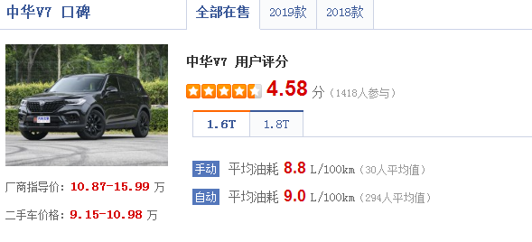 对于这台车的平均油耗来说,1.6T自动挡为9L左右,手动挡为8.8L左右,差距不大,1.8T版本的油耗为9.4L左右,对于一台重达2吨的SUV来说这个油耗还是可以接受的,而且中华V7不限里程与年限的质保也更有信心。