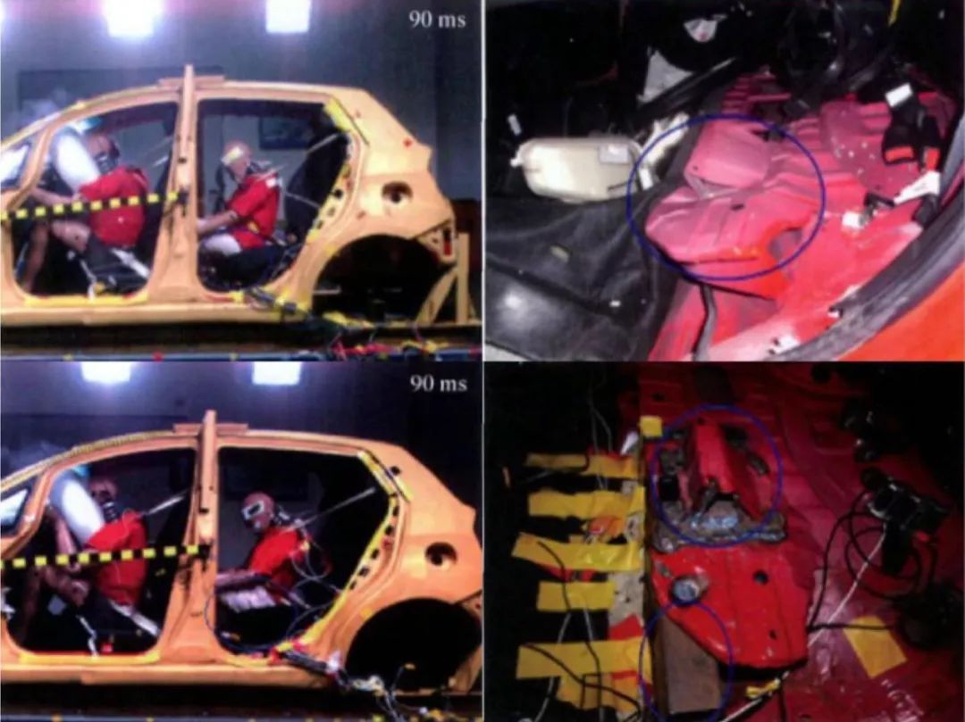 当然了,也不是说有了「皮」就完事,防下潜装置还因为设计的合理性以及结构工艺等,可能存在质量表现不一的情况。比如下面这个案例,说的就是后排防下潜装置发生下陷形变,引起假人在运动过程中发生「潜水」现象。
