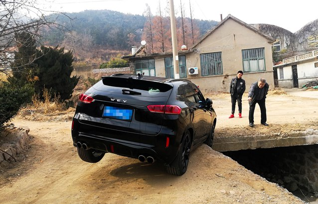 整个后轮和前轮悬空了,没有任何支撑,朋友说2个轮子悬空城市SUV四驱的话都不太容易出来,更别说两驱了,即使能硬爬出来,保险杠也要损坏,但是他们忘了VV7其实是四驱车型。