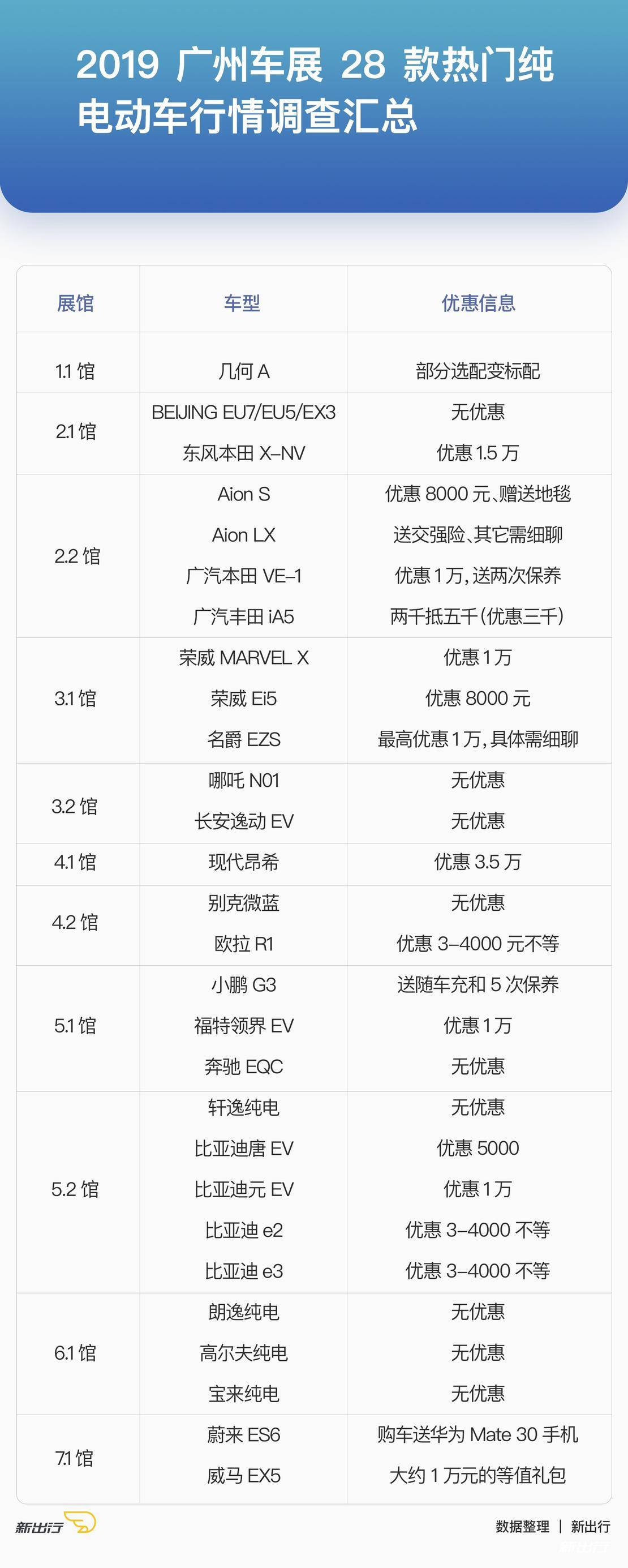 2019 广州车展目前正在如火如荼的进行着, 22 号的媒体日一过,23 号的专业观众日开始各大展台就已经站满的销售人员,帮助看车的用户提供购车方面的指导。国内的每次大车展,大部分车型都会专门针对车展推出了一些相应的购车优惠政策,这一次广州车展也不例外。新出行走访了各大热门纯电动车型展台,帮大家整理了这份车展购车优惠手册,提供给准备购车的用户一份参考,如果看到符合自己意向车型的童鞋可以去展台看看,从今天(11 月 25 日)开始直到结束的那一天,都是普通观众日。