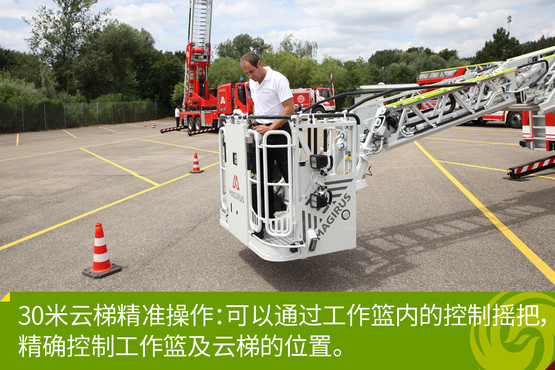 站在30米云梯的工作篮里,工作人员介绍了操作方式和体验项目,即通过两个摇把控制云梯工作篮,越过标志杆拿取A点锥筒上的,然后移动工作篮至B点,将棒球放置在锥筒的顶端。由于之前有过在bauma展(工程机械展)操作蓝牙破拆机器人以及玩PS2游戏的经历,这种双摇把控制对我来说还算轻松。我的感觉是如果在实际应用中,受过训练的救援人员可以通过云梯迅速到达相对复杂的地点,对被困人员进行有效快速地施救。