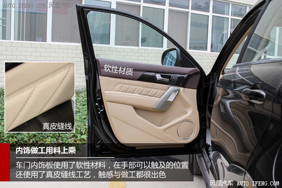 在我的身体能触碰到的地方几乎都使用了软性材质,门饰板内侧使用了与座椅相同颜色的真皮和缝线,这种细腻的触感完全不是用塑料材质可以轻松模拟的。