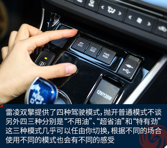 雷凌双擎还提供了四种驾驶模式,普通模式下,PCU会根据驾驶者的意图进行动力的调节。而在EV模式下,雷凌双擎会采用纯电动模式,当电力不足时会切换到普通模式。而在ECO模式下,车辆会以超级省油的模式行驶,油门的反应也会变得十分“悠闲”,当然车辆的状态也一样,有急事儿的时候一定慎用,免得自己生气。而在PWR模式下,发动机会启动,电动机和发动机会始终协同工作,这个时候雷凌的动力充沛,适时的撒一撒野也不是不行。