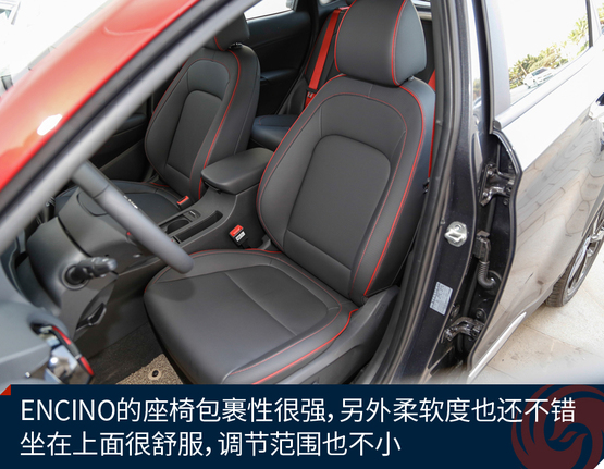 走进车内,说实话惊艳程度不如车外那么眼前一亮,不过细细品味的话,也能发现不少诚意之处。我们眼前的这台ENCINO运动版与普通版在设计上有些许不同,增添了与车外主色调一样的彩色装饰条。设计师完全考虑了当前人们的审美习惯,没有用大量的色彩去装点内饰,而是在细节之处用颜色点缀。这样的设计思路与我真是达到了十足的共鸣,颜色必须有,一点点就好。