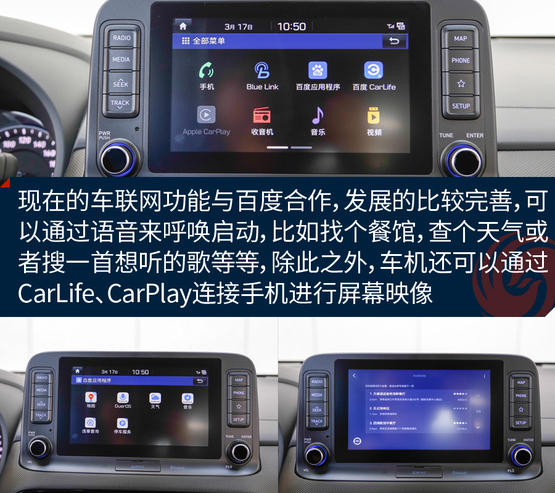 中央悬浮屏不算大,但能显示的内容却不少。北京现代和百度合作的智能网联功能一直是现代车型在合资车企中的一大亮点。这次系统进行了再度升级,不仅可以在语音控制下设定导航、控制空调等等,还能在现代自己的Bluelink里直接共享在线百度地图,便捷性有所提升。