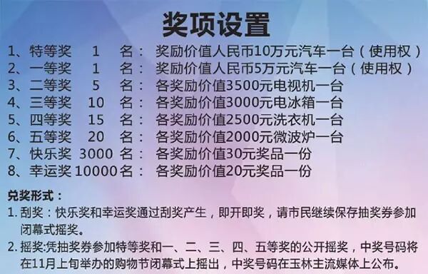 尤其是本届购物节,全市各个参加购物节活动的商家、企业将为市民带来一个月的各种优惠,而吸引人则莫过于汽车、彩电、冰箱、洗衣机等多个大奖项。奖品总价值56.5万元,中奖名额高达13052名,玉林市第五届“岭南都会”消费购物节邀您Go-购-够!