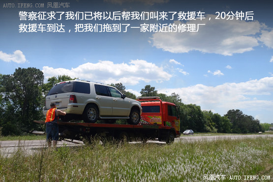 以下开始普及美国的道路救援知识。鉴于我们的车子只上了最基本的保险,所以不存在给保险公司打电话的问题,于是我拨通了提前准备好的24小时全美救援的电话,电话接通后,服务人员会根据你描述的位置转给周围的分公司,分公司的服务人员会帮你联系周围的拖车公司。由于我们无法确定具体位置,只好又把电话拨给了警察。20分钟后一名巡警路迁来处理,停在了我们车后10米的位置, 警灯全开以提示路过车辆。警察征求了我们已将以后帮我们叫来了救援车,20分钟后救援车到达,把我们拖到了一家附近的修理厂。